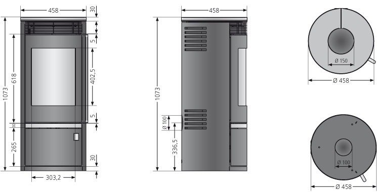 • Rauchrohranschluss: Ø 150 mm (oben), Höhe: 1060 mm